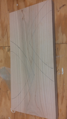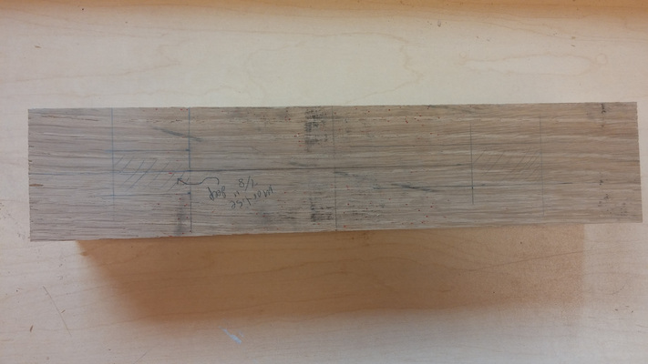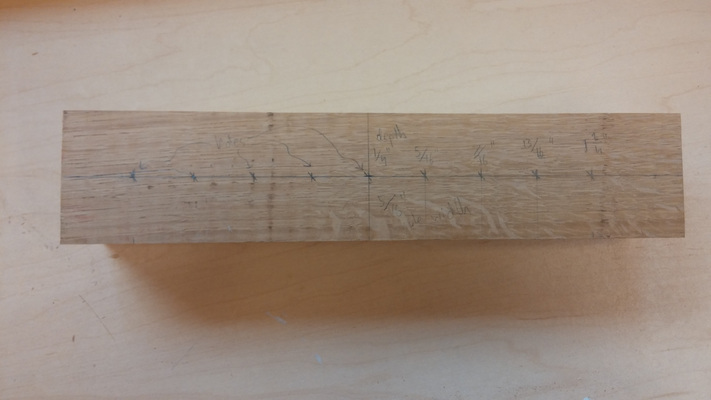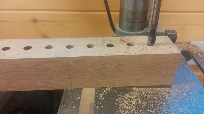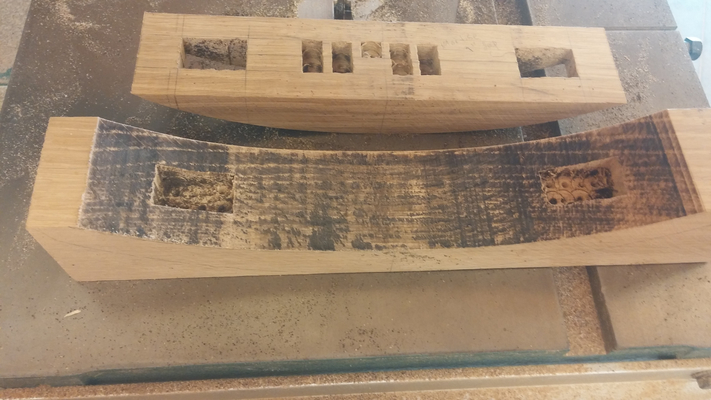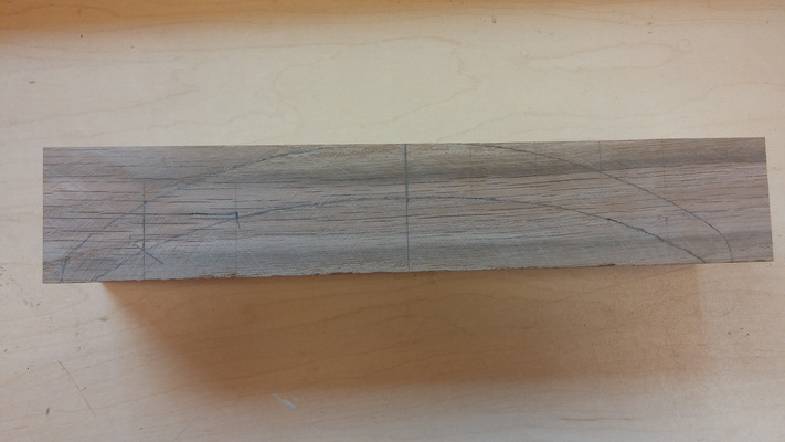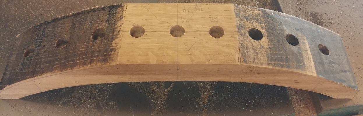 The arch includes nine holes on top, to hold the candles, and two mortises on the underside to join with the legs’ tenons. The arch required drilling holes and mortises before the arch was complete. This required me to trace the shape of the arch, and plan the depths of each hole and mortise. Construction went as follows: