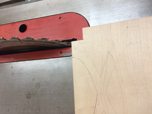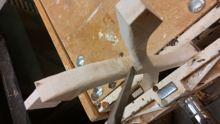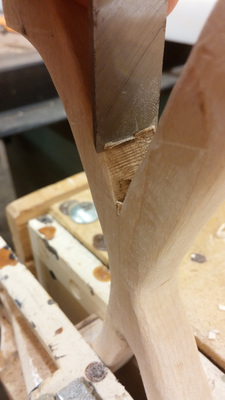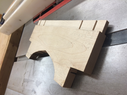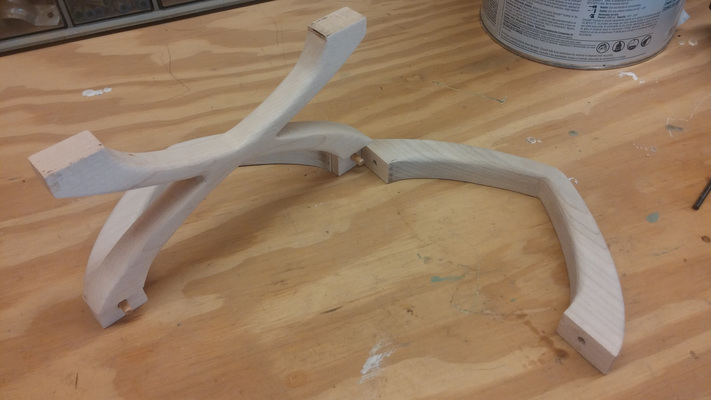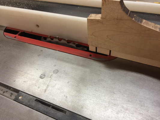 The legs and base, both sugar maple, connect by a rabbit tongue at the foot of the leg. The top of the leg inserts into a mortise in the arch. I completed the legs with the following steps: