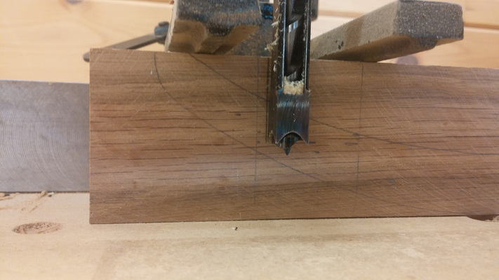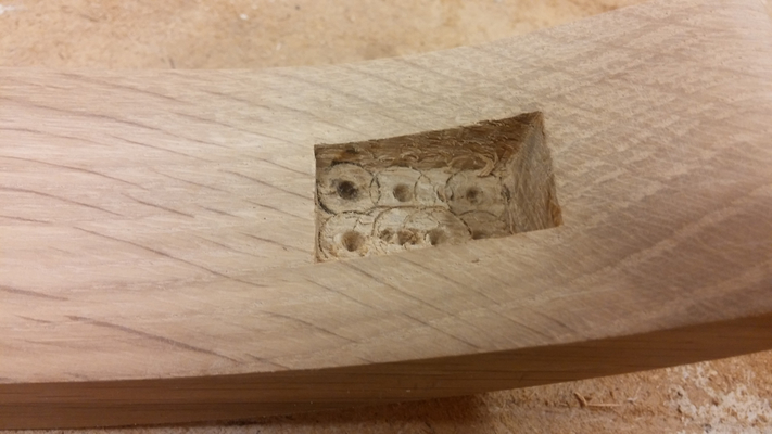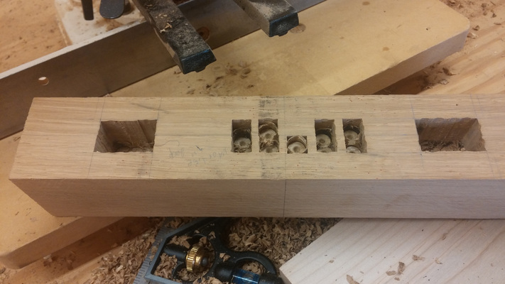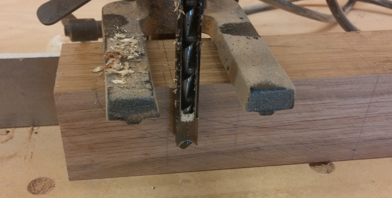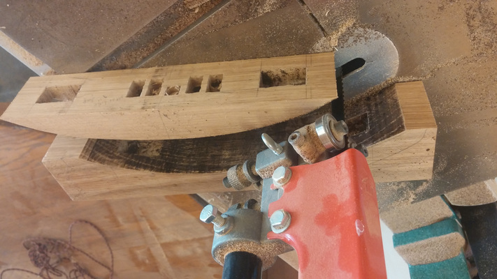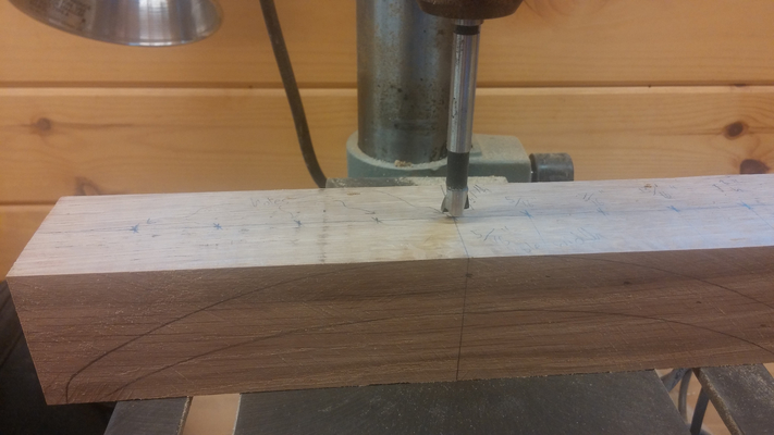 Drill mortise to accept legs’ tenons. Chisel out excess.