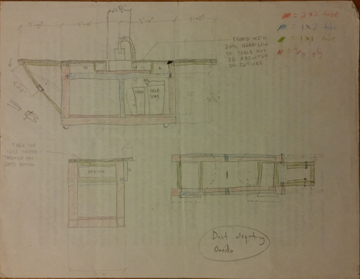 I designed the table in a few steps, first sketching (see below for an example), then rendering in a computer-animated-graphics program. I adjusted the table design several times with the technical director’s input, converging on the final design shown below.