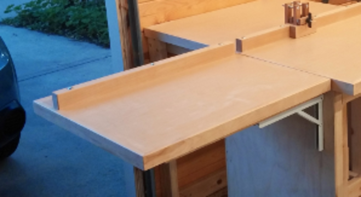 Next I constructed the bench extension. To reinforce the extension I glued another layer of scrap melamine to the under-side of the extension. I bolted more of the fence onto the extension. Finally I mounted the extension with a folding angle bracket onto the end of the table. The extension protrudes only 2$\in$ from the bench when folded.
