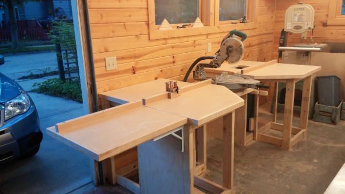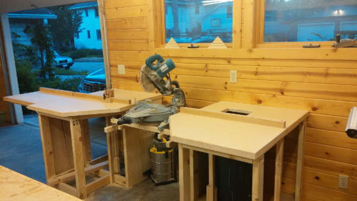 The table top is simple white melamine with pine facing. I installed a pine fence across the bench and the extensions. To keep the workspace clean I installed a drawer which tends to keep the tape measure, pencil, and speed square.