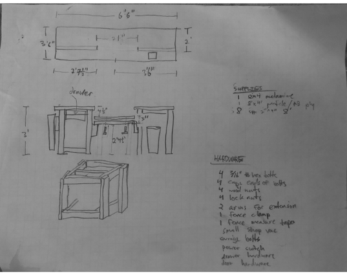 The stationary bench was a much simpler design than the rolling miter bench. My previous experience with leveling the miter saw with the table-top of the rolling bench was not positive. This time I designed a mount for the miter saw which could be adjusted in all directions. The design was relatively simple, so I only made a sketch of the table before construction shown below.