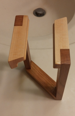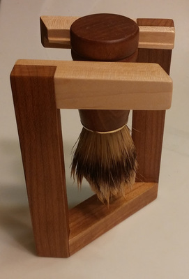 My shaving brush was not drying entirely between uses; the solution: hang it upside down. I recycled some scrap cherry and maple in the burn pile to make a modern stand about 5 inches tall to hold my shaving brush upside down.