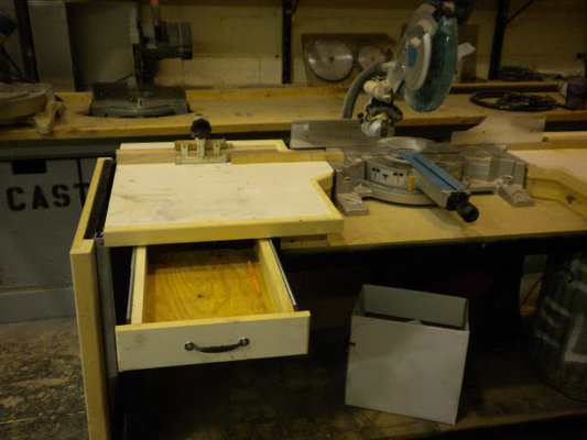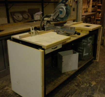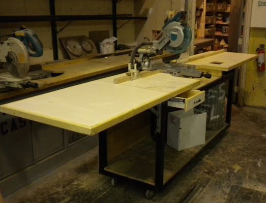 I designed and built a portable steel-frame miter-saw table for use in the Macalester College Theater Department Scene Shop. The table is 6$\ft$ long, capable of extending to 12$\ft$ with folding extensions. I installed a quick-access trash cut-out for discarding small scraps immediately after cutting. The table allows the saw to operate at the full range of its original miter angles. A vacuum below with a smart switch turns on whenever the miter saw is used, limiting the amount of sawdust. The table frame is steel mounted on four casters.