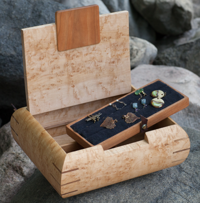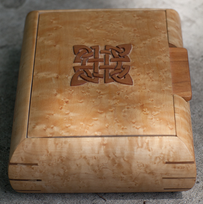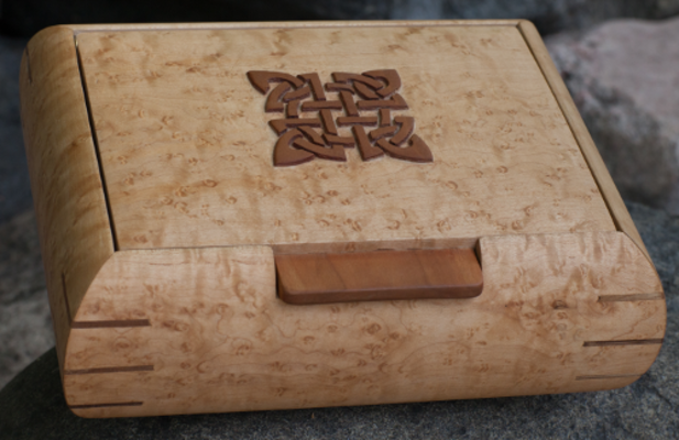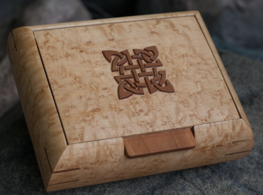 A few years ago I built a jewelry box out of Bird’s-Eye Maple and cherry as a gift. The rounded sides and lid frame the hand-carved Celtic knot as the focus of the box. The design is minimalist, yet elegant. Three compartments await inside the box, along with a padded tray which rests atop the back compartment.