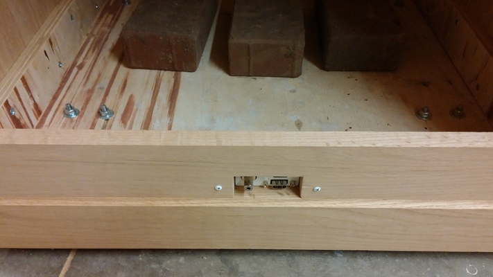 The lectern is equipped with the necessary cables for projection from a laptop. The cables run out of the bottom to be connected to the wall.